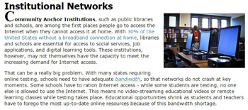 In this page, we detail the many times schools and libraries have used municipal networks to save money, increase Internet access, and provide better services. We also note how these municipal institutional networks can be incrementally expanded beyond institutions to businesses and homes, creating city-wide connectivity. Check out the page.