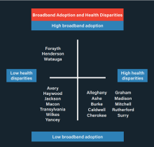 - Not one of the twenty counties in the study showed both high broadband adoption rates and health disparities. Thus, while broadband availability necessarily takes place before adoption, the latter is key.