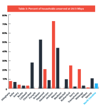 - At minimum broadband access speeds of 25 Megabits per second (Mbps) download and 3 Mbps upload — which the report calls the minimum for delivering telehealth services — an estimated 71,637 households in the 20 county-region are unserved. This accounts for 30 percent of the total estimated number of unserved households (239,945) statewide. Thus, even if telehealth programs were abundant and mature today, these households would not be able to take advantage. Solving this gap remains one of the most crucial barriers.