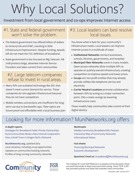 The next time you’re attending a city council meeting, a local broadband initiative committee meeting, or just chatting with neighbors about better local connectivity, take a few copies of our Why Local Solutions? fact sheet.